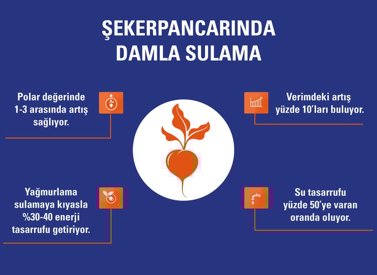 Şekerpancarı yetiştiriciliğinde yağmurlama sulamaya kıyasla %30-40 enerji tasarrufu sağlayan damla sulama, en çok şeker oranı ve kalitesinde sağladığı artışla dikkat çekiyor. Çünkü şekerpancarında şeker kalitesi, en az verim kadar büyük öneme sahip. Yağmurlama sulamaya göre damla sulama verime ve şeker oranına doğrudan etki ediyor. Yağmurlama sulamada su stresine dayanıksızlaşan şekerpancarının kılcal kökleri az gelişiyor, bu da su ve gübreyi az almasına yol açıyor. Damla sulamada ise doğrudan suyu alan köklerde kılcal damar gelişimi yüksek seviyede oluyor, iyi beslenen bitkinin şeker kalitesi de artıyor. Damla sulama ile şekerpancarında verimde %10, polarda da 1-3 arasında fark görülüyor.