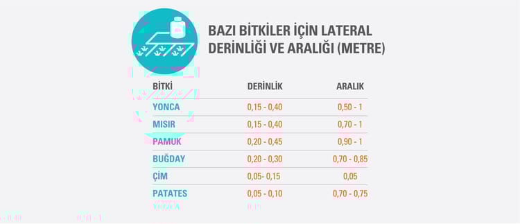 Toprak altı damla sulama sisteminin tasarımı sırasında bitki ve toprak çeşidine göre laterallerin yerleştirilme derinlikleri ve aralıkları belirleniyor. Bitki çeşidine göre lateral boruların yerleştirilme derinliği 2-70 cm aralığında olabiliyor. Toprağın 5-15 cm altına yerleştirilen sistemler saçak köke sahip bitki yetiştiriciliği için uygunken, toprak yüzeyinden 25 cm derinliğe yerleştirilen sistemler daha çok domates, patlıcan, biber ve fasulye için kullanılıyor. Derin kök yapısına sahip mısır, yonca, karpuz ve kabak gibi tek ve çok yıllık bitkilerde ise lateral borular toprağın 30-70 cm altına yerleştiriliyor.